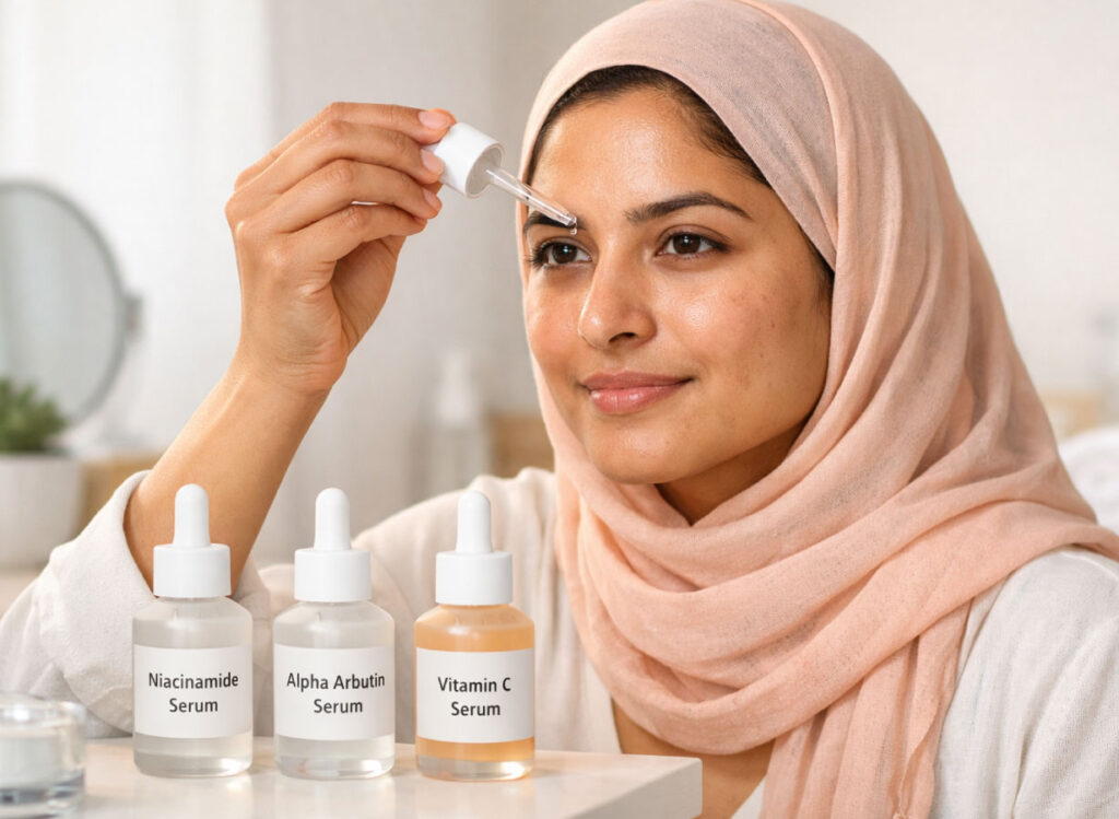 - Apply niacinamide or arbutin serum at night.