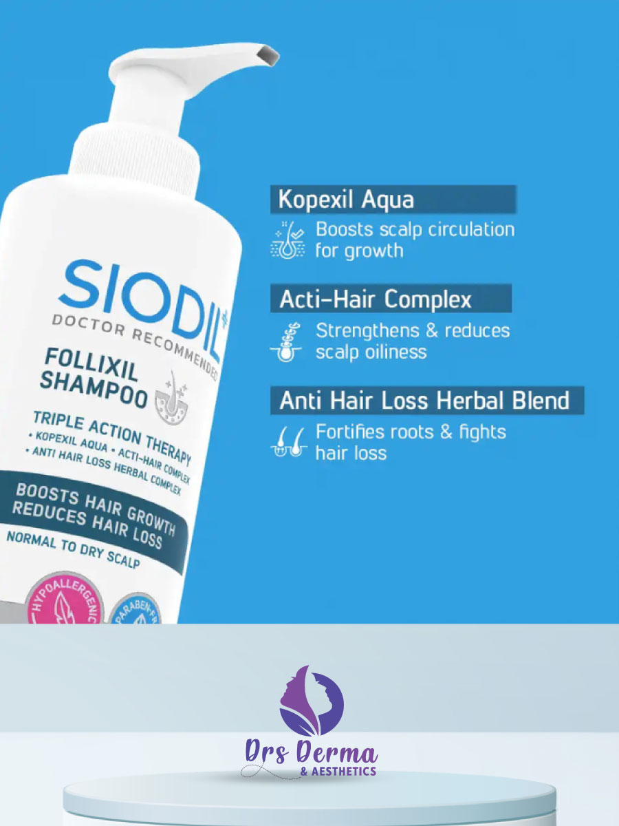 Siodil Follixil Shampoo is specially formulated to support hair fall control and scalp nourishment. Its advanced formula helps strengthen weak hair roots, reduce breakage, and improve overall hair thickness with regular use.