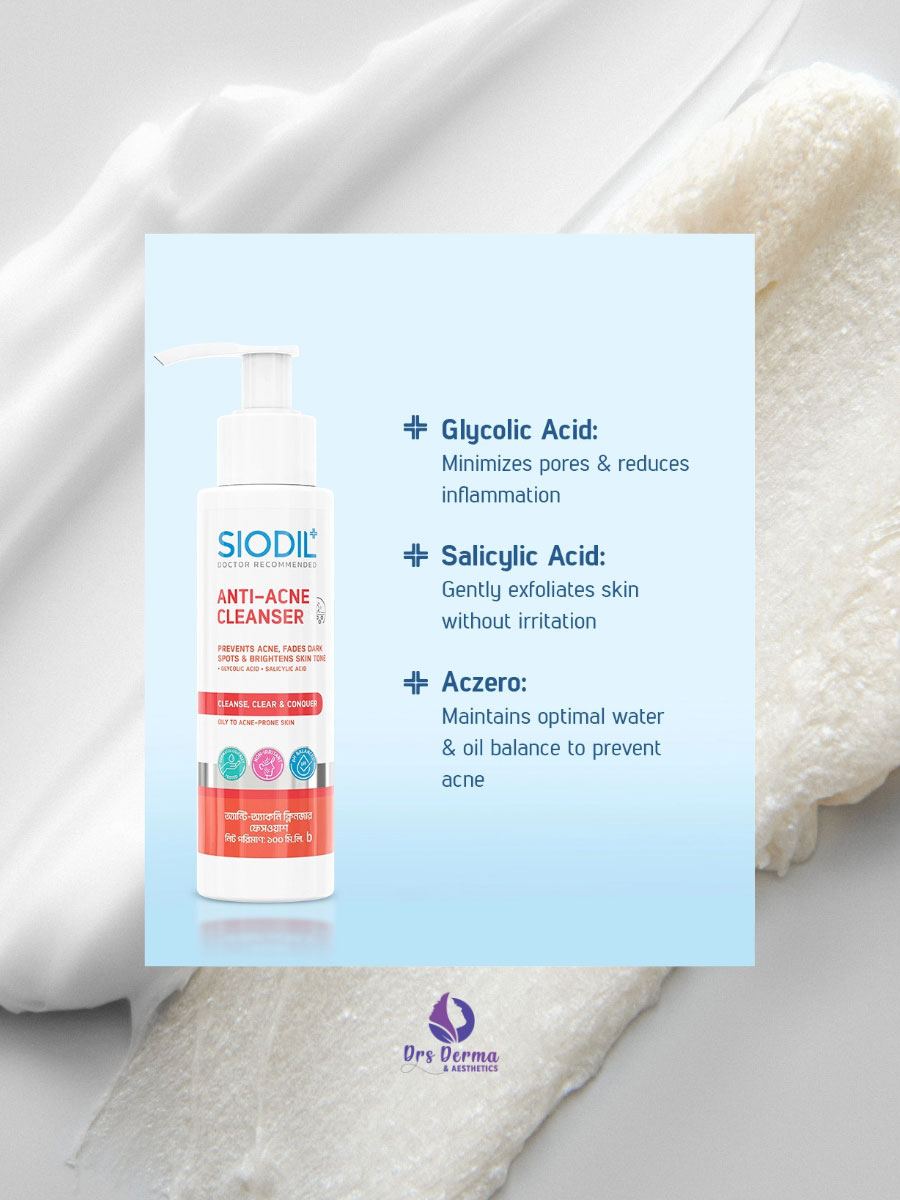 Siodil Glycolic Brightening Cleanser is a dermatologist-inspired face wash designed to gently exfoliate, cleanse, and brighten the skin without causing irritation. Enriched with glycolic acid, this cleanser helps remove dead skin cells, unclog pores, and promote healthy skin renewal.